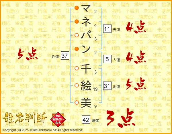マ(2画)ネ(4画)パ(3画)ン(2画) 千(3画)絵(19画)美(9画)