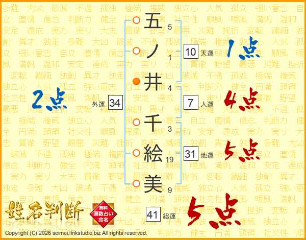 五ノ井千絵美さんの総運は41画の5点!