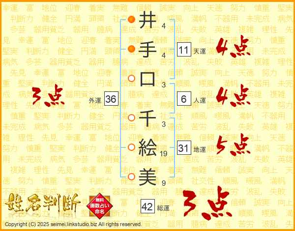 井(4画)手(4画)口(3画) 千(3画)絵(19画)美(9画)