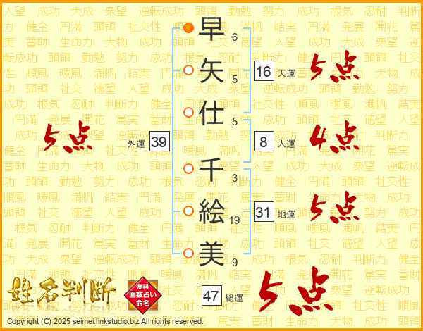 早(6画)矢(5画)仕(5画) 千(3画)絵(19画)美(9画)