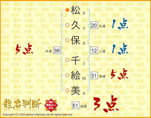 松(8画)久(3画)保(9画) 千(3画)絵(19画)美(9画)