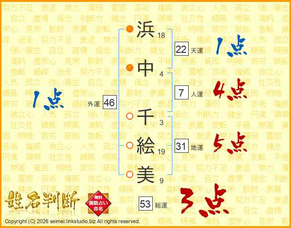 浜(18画)中(4画) 千(3画)絵(19画)美(9画)
