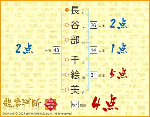 長(8画)谷(7画)部(11画) 千(3画)絵(19画)美(9画)