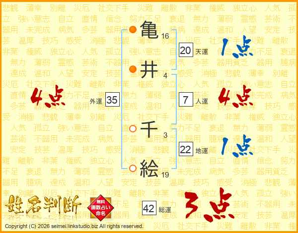 亀(16画)井(4画) 千(3画)絵(19画)
