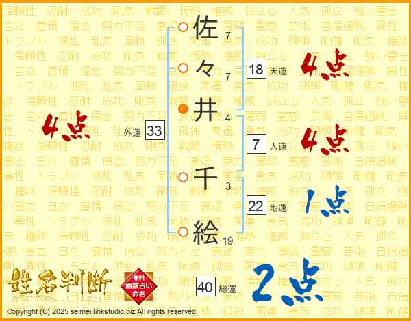 佐(7画)々(7画)井(4画) 千(3画)絵(19画)
