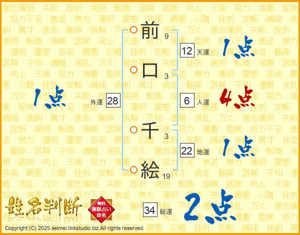 生活面を象徴する運勢です。外部から受ける影響力を表し、結婚運、家庭運や職場、環境への順応性を表します。総運から人運を引いた画数。姓や名が1文字の場合を除く。