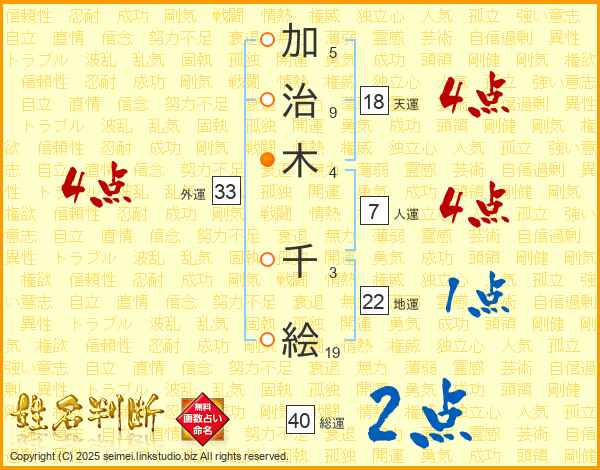 加(5画)治(9画)木(4画) 千(3画)絵(19画)