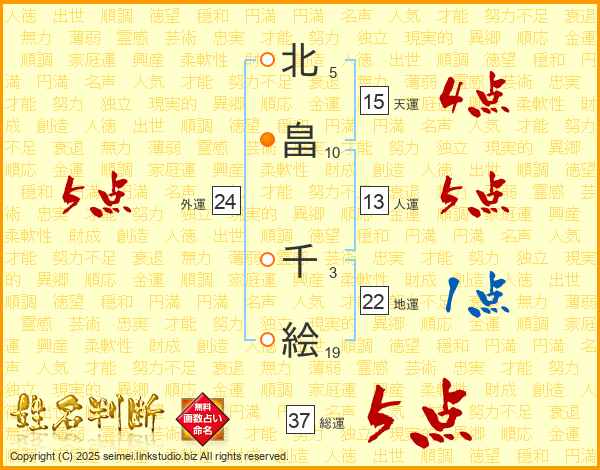 北畠千絵さんの総運は37画の5点!