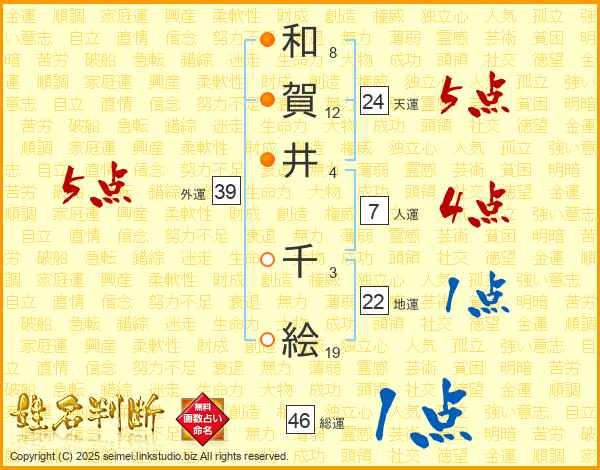 和(8画)賀(12画)井(4画) 千(3画)絵(19画)