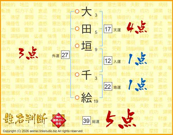 大(3画)田(5画)垣(9画) 千(3画)絵(19画)