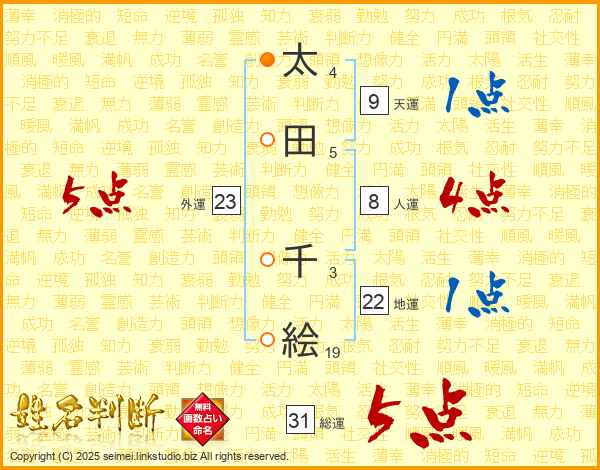生活面を象徴する運勢です。外部から受ける影響力を表し、結婚運、家庭運や職場、環境への順応性を表します。総運から人運を引いた画数。姓や名が1文字の場合を除く。