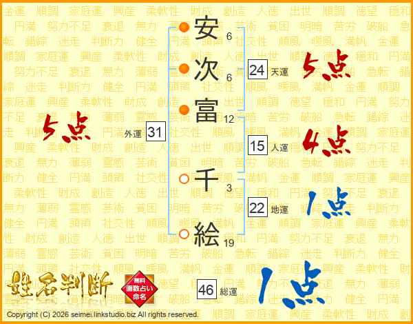 安(6画)次(6画)富(12画) 千(3画)絵(19画)