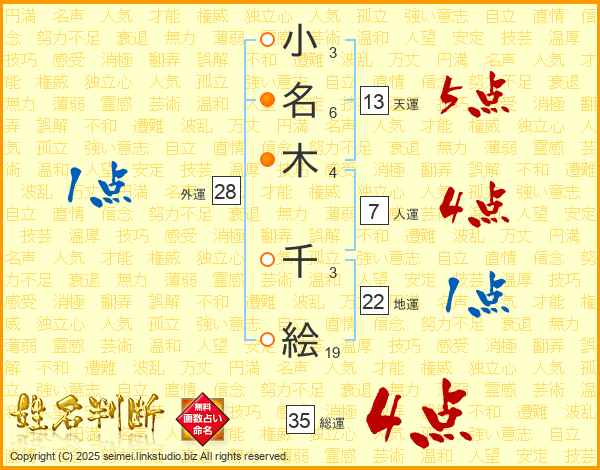 小(3画)名(6画)木(4画) 千(3画)絵(19画)