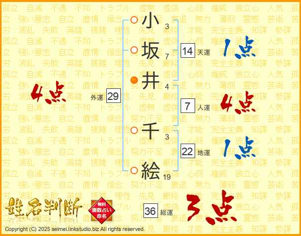 小(3画)坂(7画)井(4画) 千(3画)絵(19画)