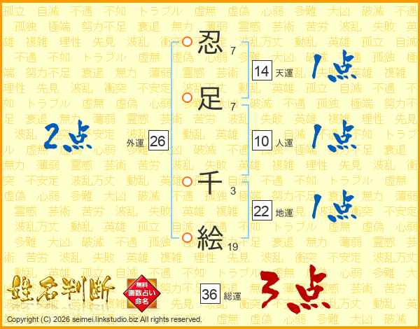 生活面を象徴する運勢です。外部から受ける影響力を表し、結婚運、家庭運や職場、環境への順応性を表します。総運から人運を引いた画数。姓や名が1文字の場合を除く。