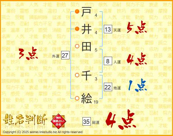 戸(4画)井(4画)田(5画) 千(3画)絵(19画)