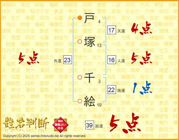 戸(4画)塚(13画) 千(3画)絵(19画)