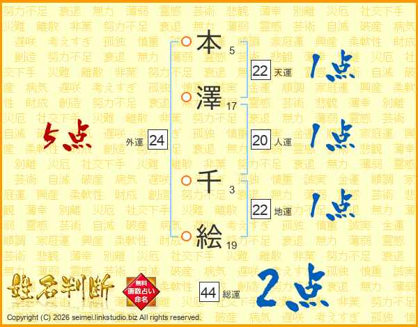生活面を象徴する運勢です。外部から受ける影響力を表し、結婚運、家庭運や職場、環境への順応性を表します。総運から人運を引いた画数。姓や名が1文字の場合を除く。