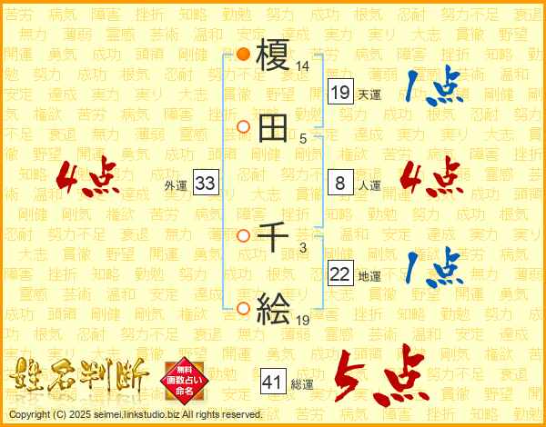 生活面を象徴する運勢です。外部から受ける影響力を表し、結婚運、家庭運や職場、環境への順応性を表します。総運から人運を引いた画数。姓や名が1文字の場合を除く。
