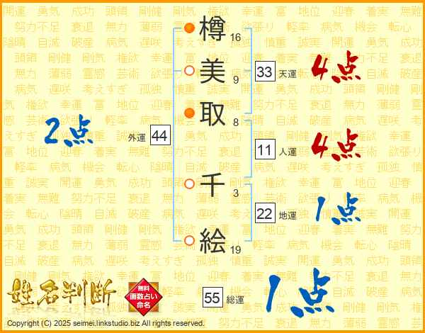 樽(16画)美(9画)取(8画) 千(3画)絵(19画)
