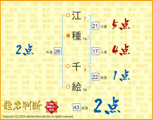 生活面を象徴する運勢です。外部から受ける影響力を表し、結婚運、家庭運や職場、環境への順応性を表します。総運から人運を引いた画数。姓や名が1文字の場合を除く。