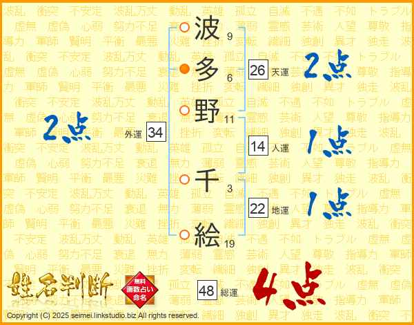波(9画)多(6画)野(11画) 千(3画)絵(19画)