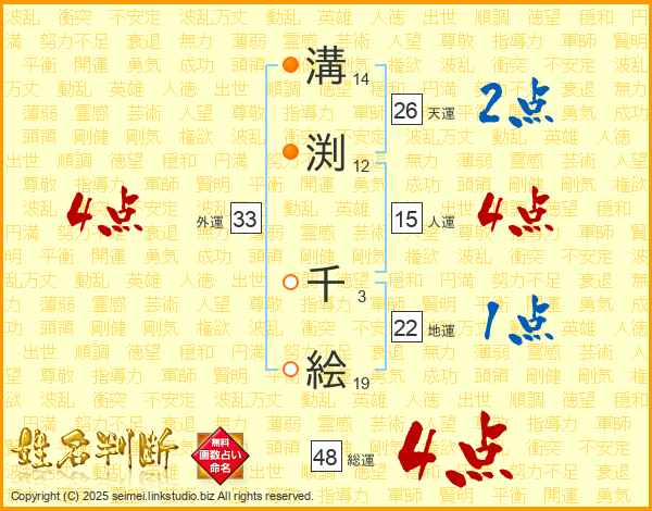 生活面を象徴する運勢です。外部から受ける影響力を表し、結婚運、家庭運や職場、環境への順応性を表します。総運から人運を引いた画数。姓や名が1文字の場合を除く。