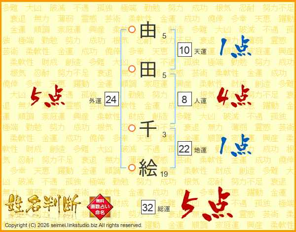生活面を象徴する運勢です。外部から受ける影響力を表し、結婚運、家庭運や職場、環境への順応性を表します。総運から人運を引いた画数。姓や名が1文字の場合を除く。