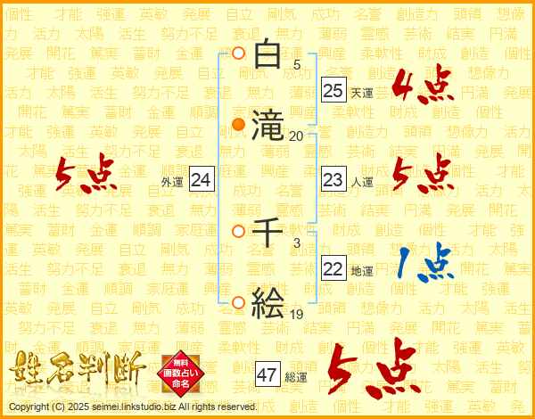 生活面を象徴する運勢です。外部から受ける影響力を表し、結婚運、家庭運や職場、環境への順応性を表します。総運から人運を引いた画数。姓や名が1文字の場合を除く。