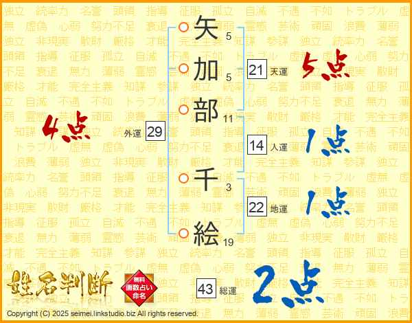 矢加部千絵さんの天運は21画の5点!