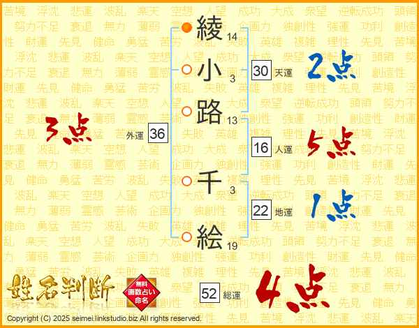 綾(14画)小(3画)路(13画) 千(3画)絵(19画)