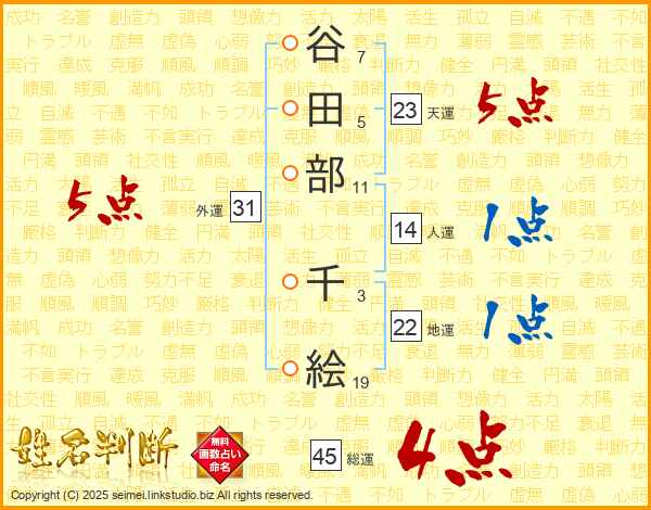 谷(7画)田(5画)部(11画) 千(3画)絵(19画)