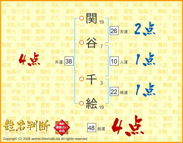 生活面を象徴する運勢です。外部から受ける影響力を表し、結婚運、家庭運や職場、環境への順応性を表します。総運から人運を引いた画数。姓や名が1文字の場合を除く。