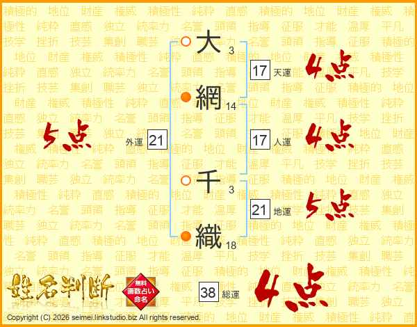 大網千織さんの総運は38画の4点!