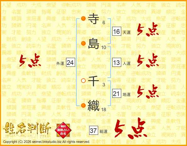 あなたの人生を表す1番重要な運勢です。生涯を通じて影響する総合運となり、主に50歳以降の晩年期に影響を及ぼします。苗字と名前の合計画数。