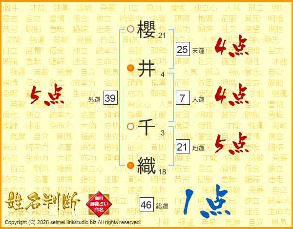 櫻井千織さんの総運は46画の1点!