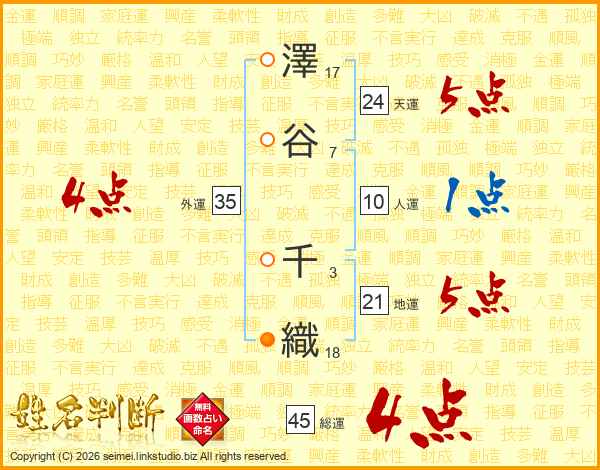 澤谷千織さんの総運は45画の4点!