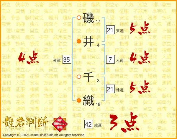 磯井千織さんの外運は35画の4点!