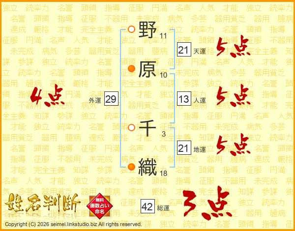 あなたの人生を表す1番重要な運勢です。生涯を通じて影響する総合運となり、主に50歳以降の晩年期に影響を及ぼします。苗字と名前の合計画数。