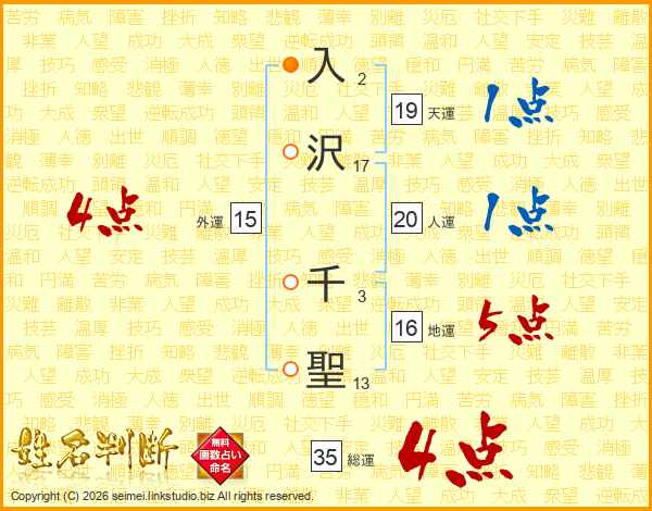入(2画)沢(17画) 千(3画)聖(13画)