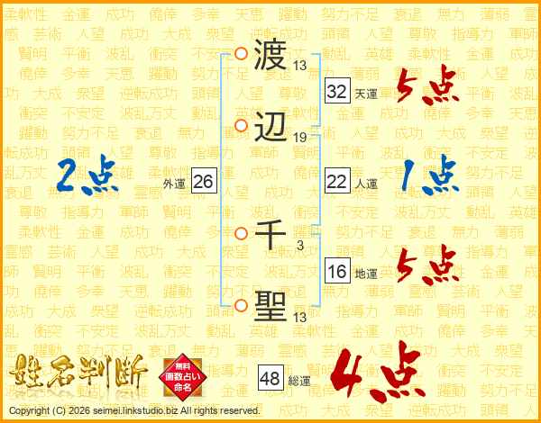 渡(13画)辺(19画) 千(3画)聖(13画)