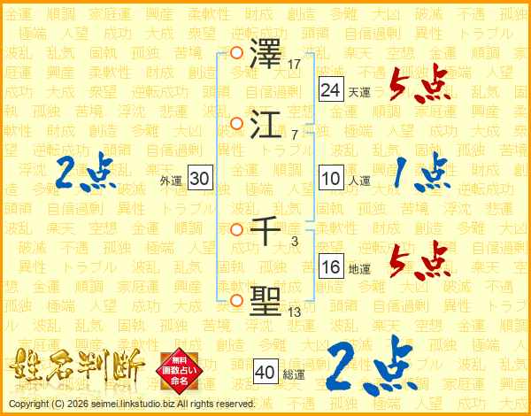澤(17画)江(7画) 千(3画)聖(13画)