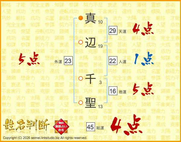 あなたの人生を表す1番重要な運勢です。生涯を通じて影響する総合運となり、主に50歳以降の晩年期に影響を及ぼします。苗字と名前の合計画数。