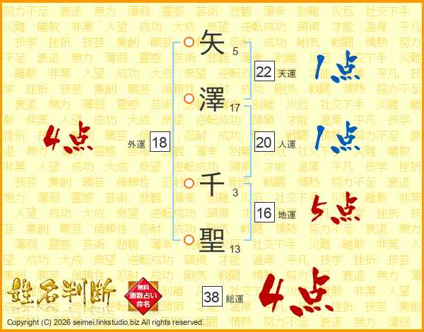 矢(5画)澤(17画) 千(3画)聖(13画)