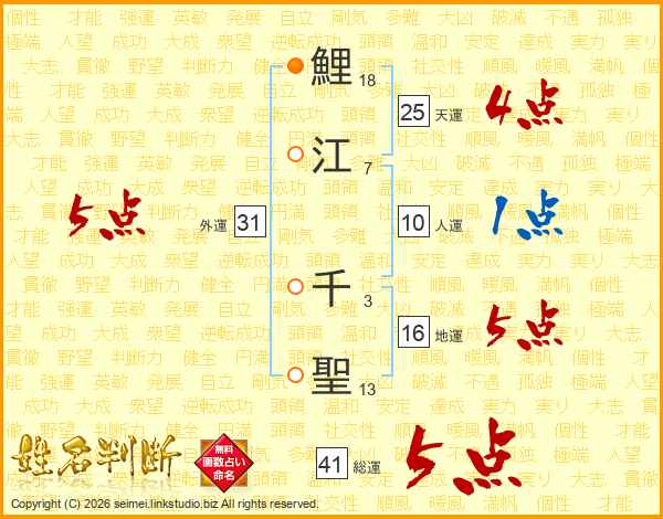 鯉江千聖さんの総運は41画の5点!