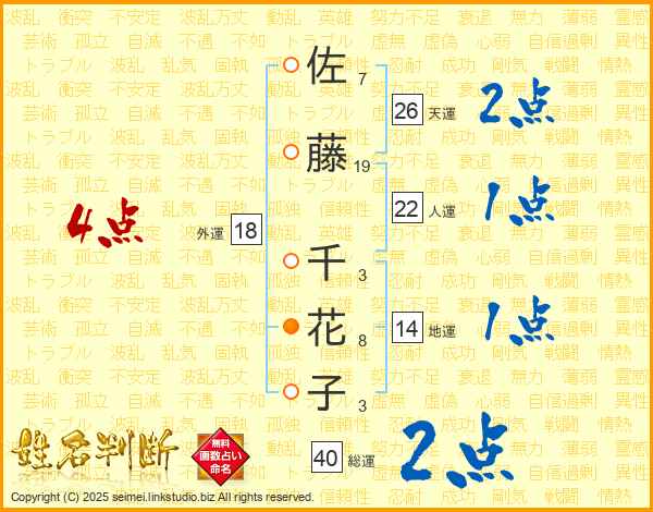 佐(7画)藤(19画) 千(3画)花(8画)子(3画)