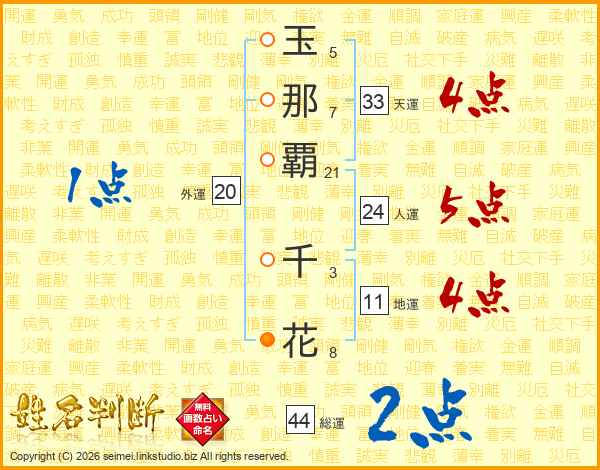 玉(5画)那(7画)覇(21画) 千(3画)花(8画)