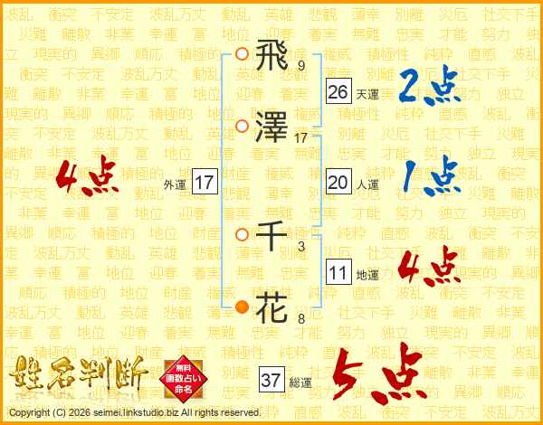 生活面を象徴する運勢です。外部から受ける影響力を表し、結婚運、家庭運や職場、環境への順応性を表します。総運から人運を引いた画数。姓や名が1文字の場合を除く。