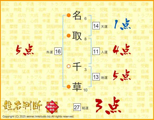 生活面を象徴する運勢です。外部から受ける影響力を表し、結婚運、家庭運や職場、環境への順応性を表します。総運から人運を引いた画数。姓や名が1文字の場合を除く。