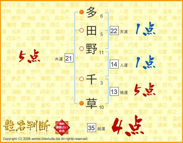多(6画)田(5画)野(11画) 千(3画)草(10画)